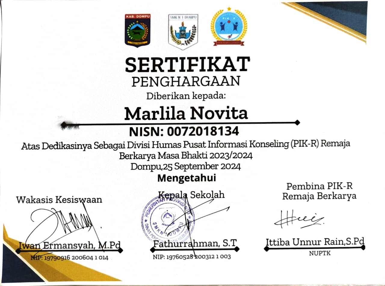 Menjabat sebagai anggota divisi Humas pada Pusat Informasi dan Konseling Remaja (PIK-R) di SMK Negeri 1 Dompu, berkontribusi dalam mengelola komunikasi dan promosi kegiatan remaja.