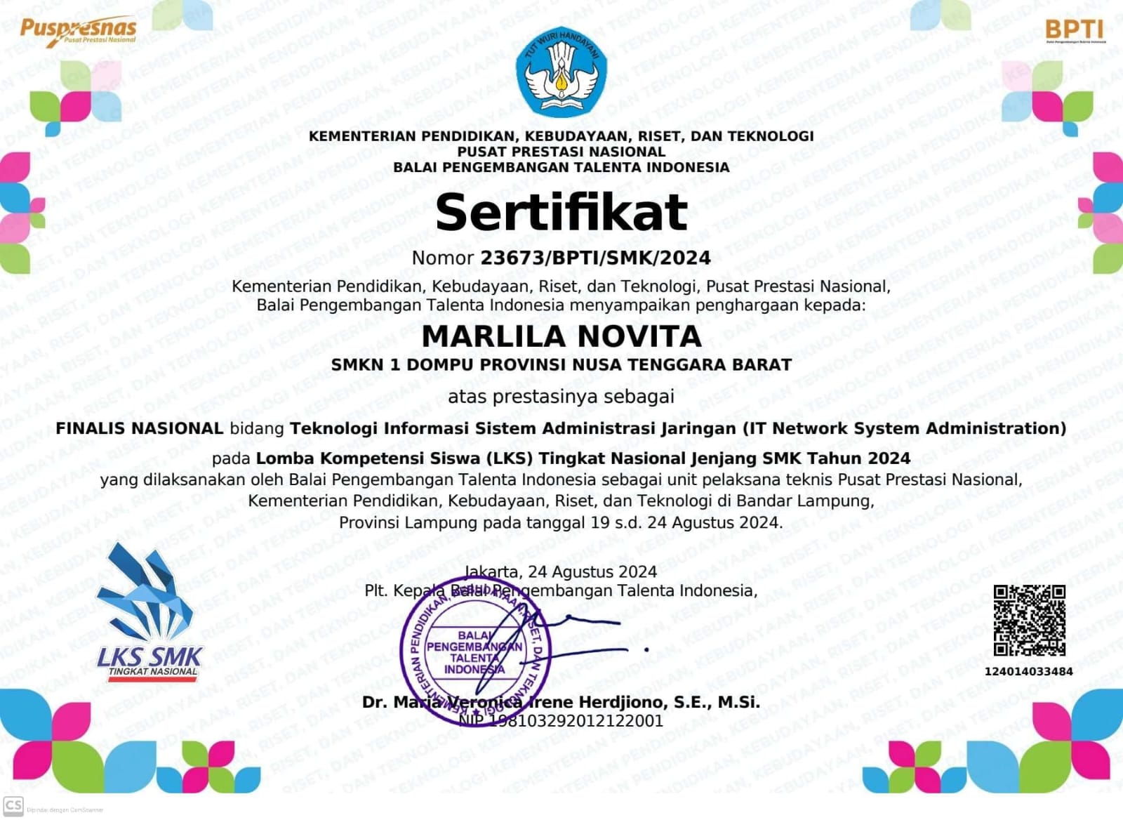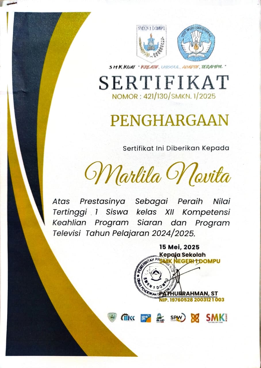 Meraih penghargaan sebagai siswa terbaik pertama di kompetensi keahlian Broadcasting dan Perfilman pada tahun 2025 di SMK Negeri 1 Dompu.